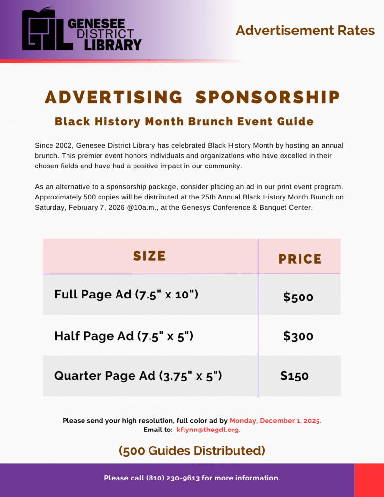 As an alternative to sponsorship, consider placing an ad in our print event program. Approximately 500 copies will be distributed at the 25th Annual Black History Month Brunch on Saturday, February 7, 2026, at the Genesys Conference & Banquet Center.